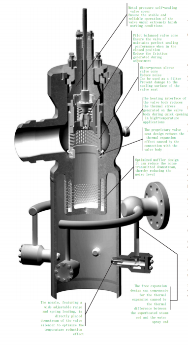 The integrated temperature reduction section is directly arranged downstream of the second stage and consists of various spray temperature reducers equipped with nozzles or Parker valves in a steam compositechamber. The selection of the temperature reduction section must be based on operating conditions, factory layout, and process control requirements.